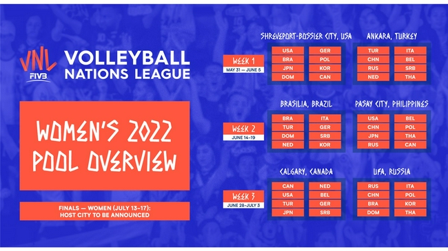 第一个比赛周将于2022年5月31日至6月5日上演,中国女排的同组对手是土耳其、俄罗斯、荷兰、意大利、比利时、塞尔维亚、泰国,比赛地为土耳其安卡拉。