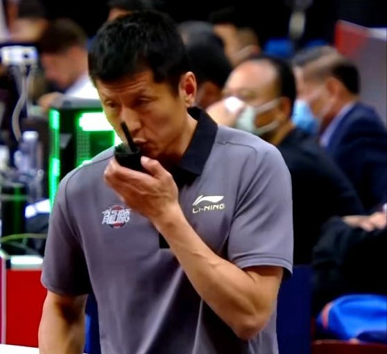 比赛过程中,现场镜头抓拍到助理教练鞠维松手拿对讲机的画面。