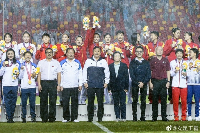 昨晚全运会女足决赛,奥运联合队1-0战胜上海女足夺得金牌,国家体育局副局长杜兆才现场观看比赛,赛后与女足全体队员和教练组亲切合影。